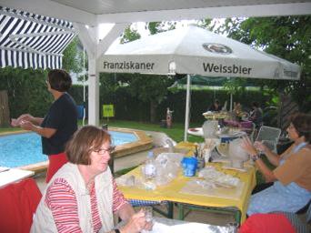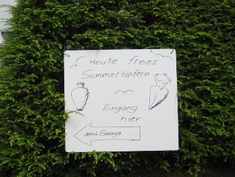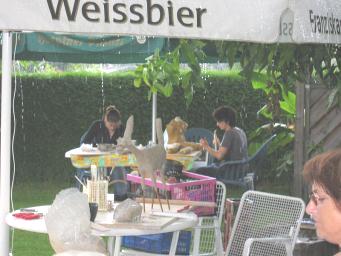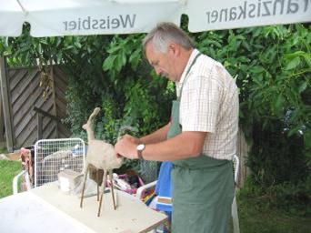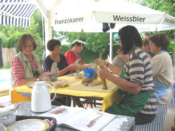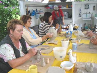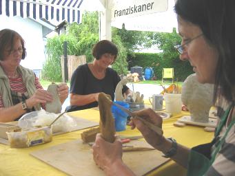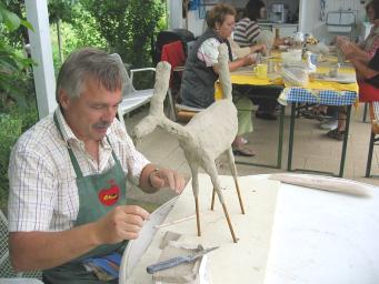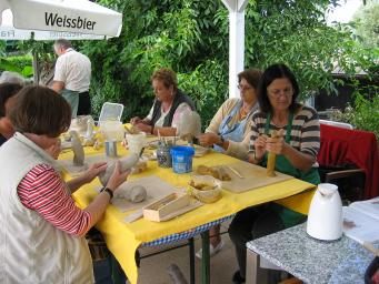 28.07.2007 Im Garten des Künstlers entstanden in geselliger Runde verschiedene Kunstobjekte, von Engel, Torsi, Enten bis zu Fabelwesen. Trotz des wenig sommerlich wirkenden Wetters war die Stimmung und Kreativität der Workshopteilnehmer beim 5. Sommertöpfern ungetrübt. Café und Kuchen umrahmten das Programm und gaben den Besuchern in ihren Schaffenspausen neue Inspiration und Kraft. Ingbert Maisch unterstütze wie immer die bunt gemischten Teilnehmer mit ihren unterschiedlichen Übungsgraden, von Anfängern bis Routinees, durch sein künstlerisches Wissen. |